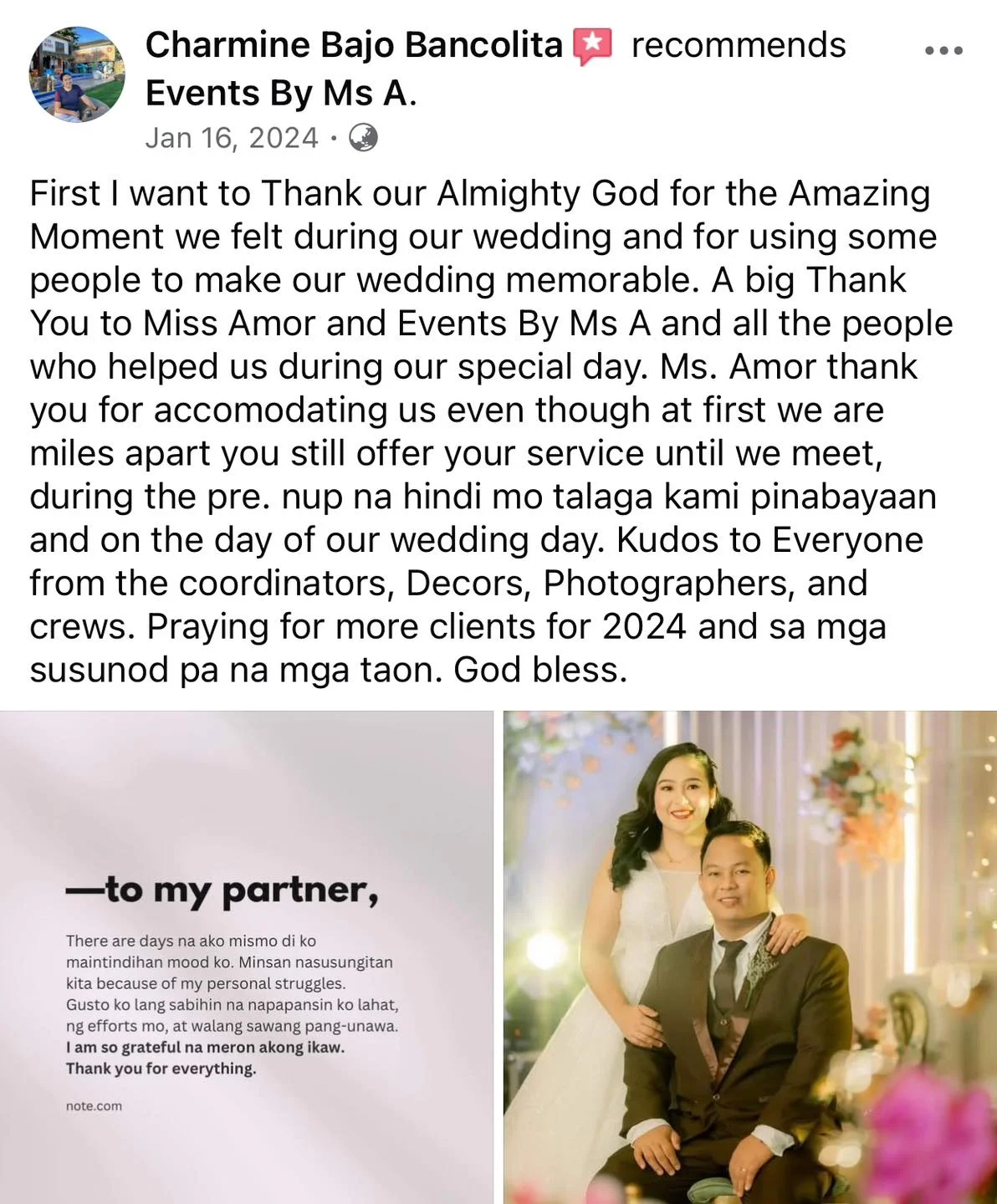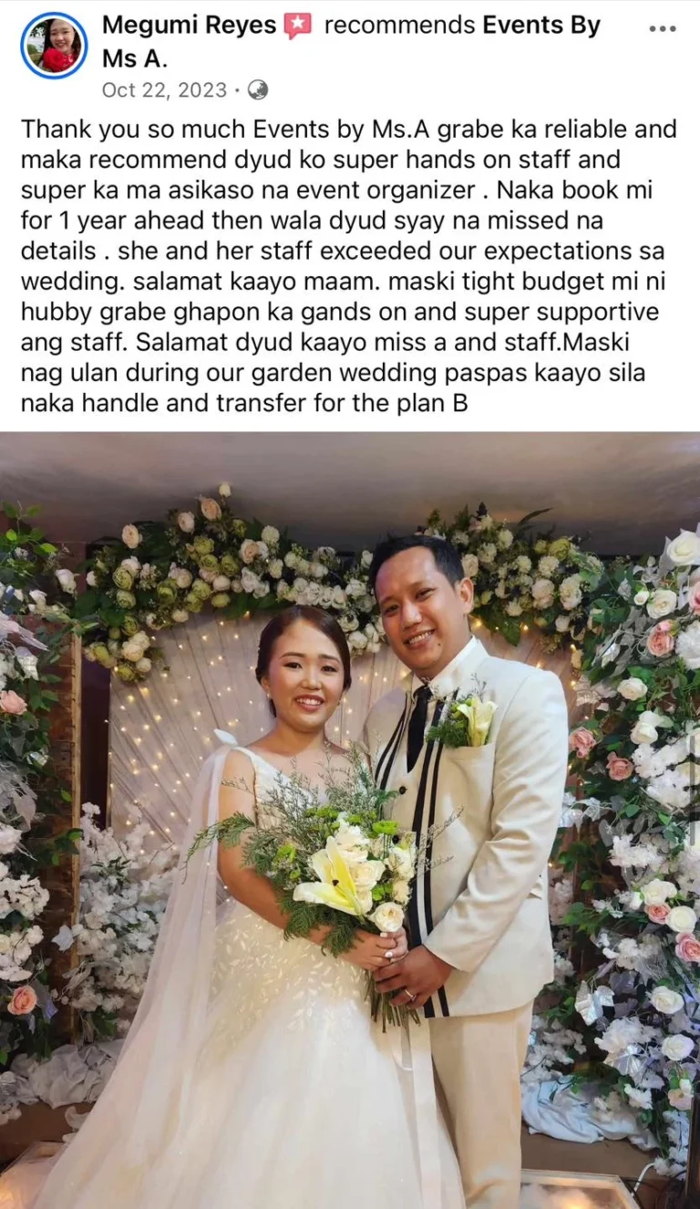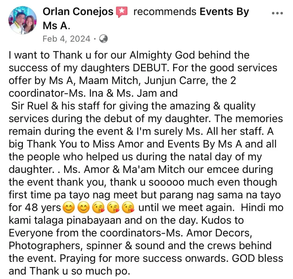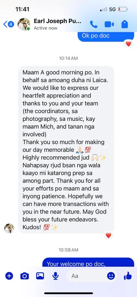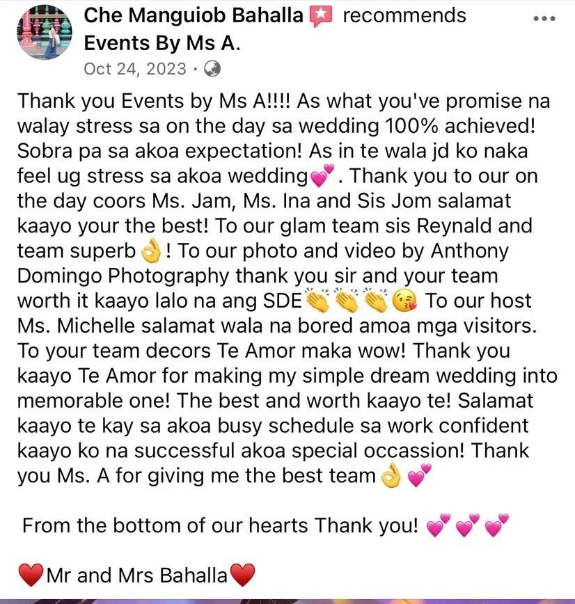 To Ms. Amor and her Staffs. Many thanks to all 💕💕🤩 Wla jod mi nagkamali sa pagpili sa inyu as my wedding planner...fully satisfied jd mi sa inyung service. Very professional kaau mo og ang imung mga staffs tpus very accommodating pa jd kaau.. Wla mi nagkaproblema or nastress kay 💯% friendly kaau.. Salamt sa convenient package highly recommended sa mga couple na short ang budget kay si Ms. A na ang mg.adjust 🤔👌✌️ for them . buotan kaau mo Maam..Salamat2x kaau.. God Bless All and love u all.and Ninang Amor🖤 Sincerely yours 🤭🤭🤗🤗 Jonathan & Marry
