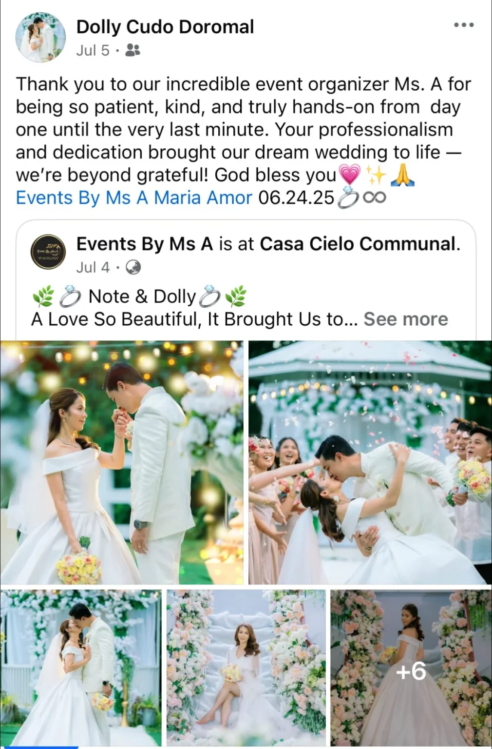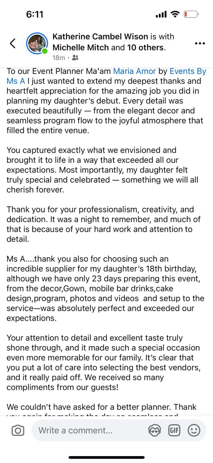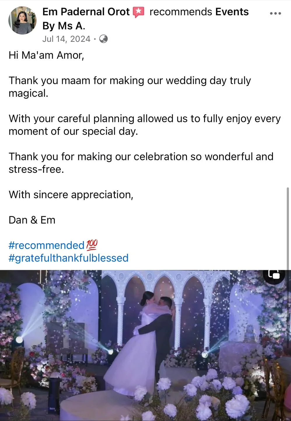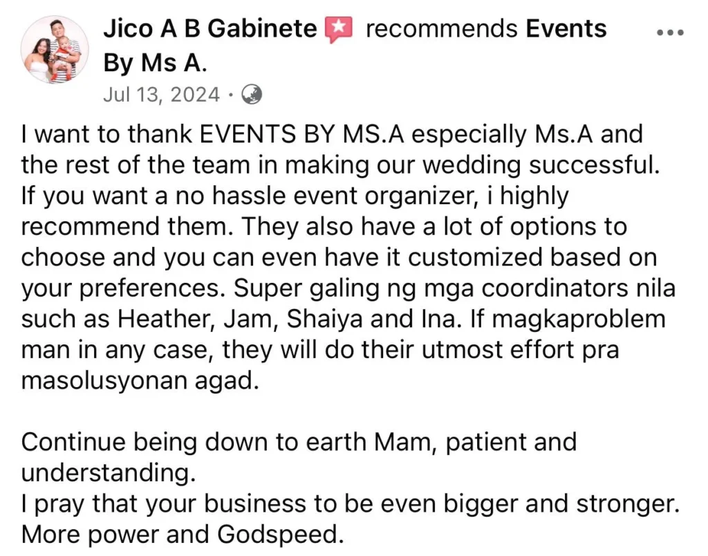 To Ms. Amor and her Staffs. Many thanks to all 💕💕🤩 Wla jod mi nagkamali sa pagpili sa inyu as my wedding planner...fully satisfied jd mi sa inyung service. Very professional kaau mo og ang imung mga staffs tpus very accommodating pa jd kaau.. Wla mi nagkaproblema or nastress kay 💯% friendly kaau.. Salamt sa convenient package highly recommended sa mga couple na short ang budget kay si Ms. A na ang mg.adjust 🤔👌✌️ for them . buotan kaau mo Maam..Salamat2x kaau.. God Bless All and love u all.and Ninang Amor🖤 Sincerely yours 🤭🤭🤗🤗 Jonathan & Marry